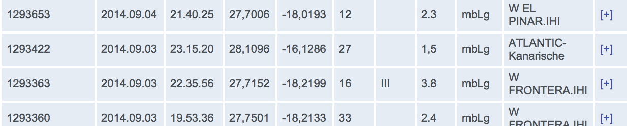 Die meisten Beben gab es jedoch natürlich in der Nähe der jüngsten Insel – El Hierro. Und so muss es nicht wundern, dass es auch in dieser Woche wieder ordentlich im Westen der Inselkette wackelte: Bis zu deutlich spürbaren 3,8 bebte die Erde in 16,6 Kilometern Tiefe – 3,9 Kilometer vor der Westküste. Wenn man mal die stärkeren Beben im Atlantik der vergangenen Wochen mitrechnet – nördlich der Kanaren -, ist die Bebenaktivität unverändert hoch.